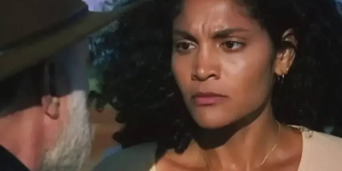 Ao saber que eles estão pela área, Aline aparece com uma espingarda apontada para eles: “Vocês todos! Vão dando o fora das minhas terras”.